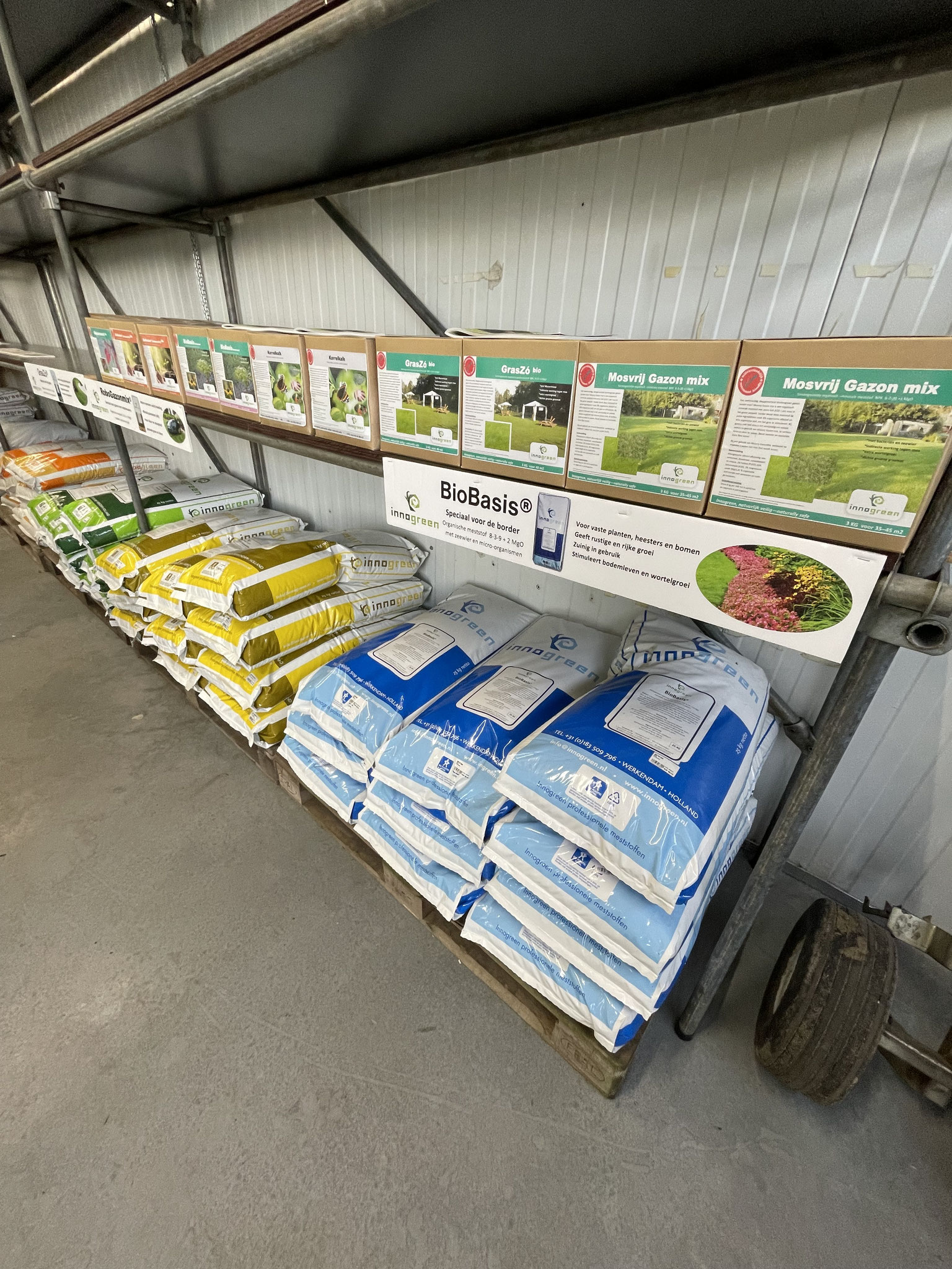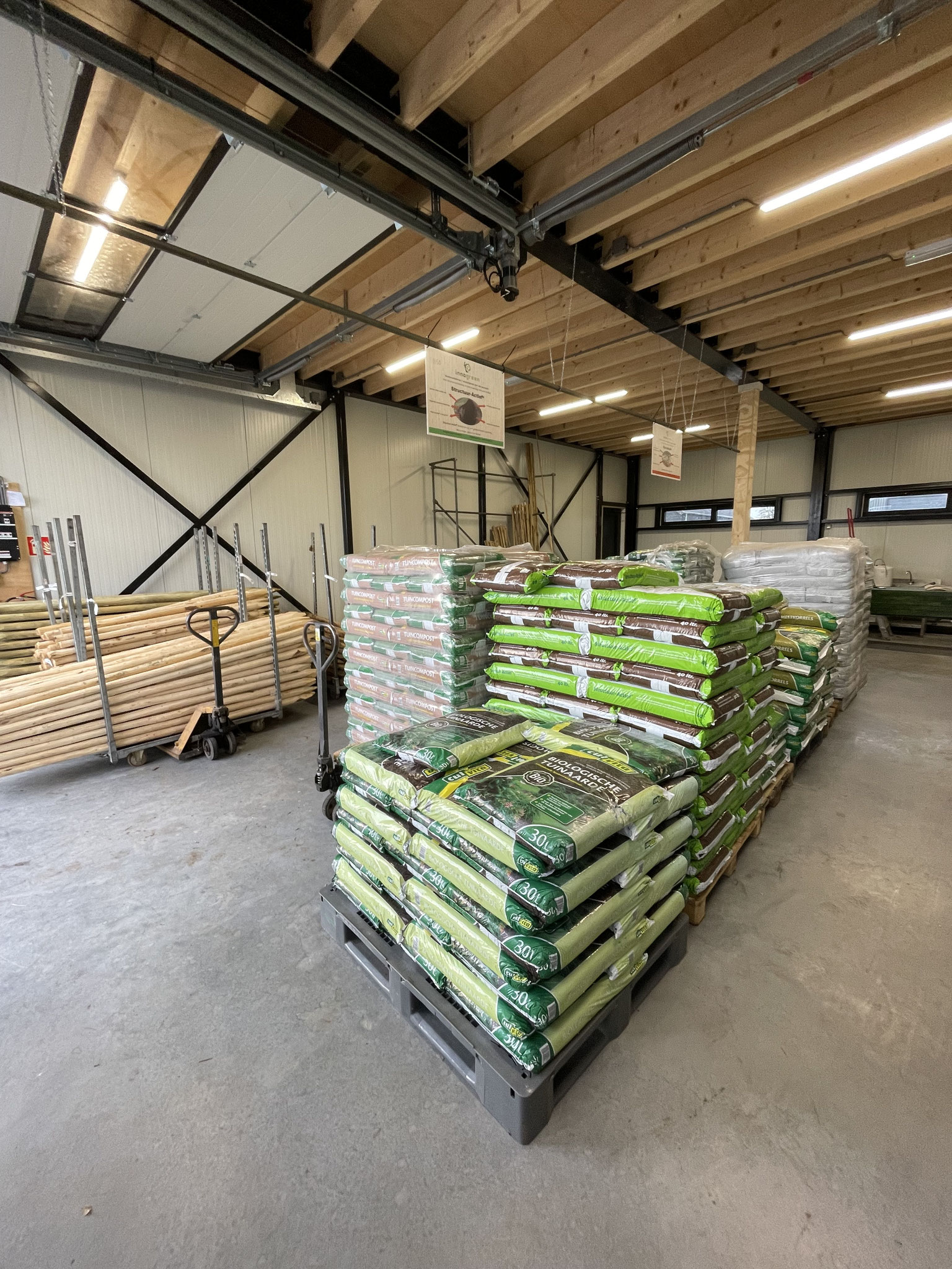 We hebben een nieuwe binnenruimte op onze kwekerij, hierin verkopen wij verschillende soorten meststoffen, grondsoorten en tuinartikelen als boompalen.